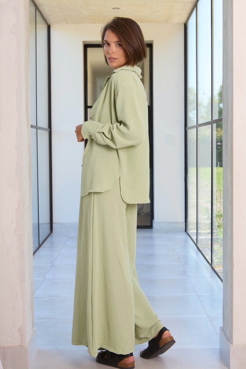 Presenta mangas largas con botón para arrollar, cartera con botones al tono y terminación redondeada en el ruedo.
