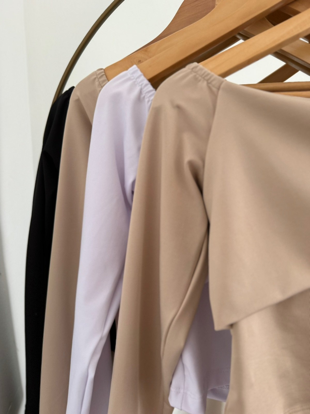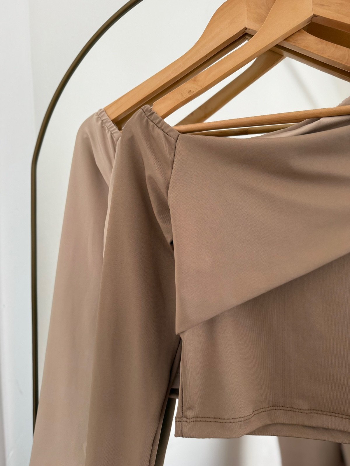 Camiseta off shoulder en tono beige, de manga larga y delicado diseño cruzado en el frente que realza la silueta. Confeccionada en micro morley con lycra, un tejido suave y elástico que ofrece un calce ajustado y cómodo.
