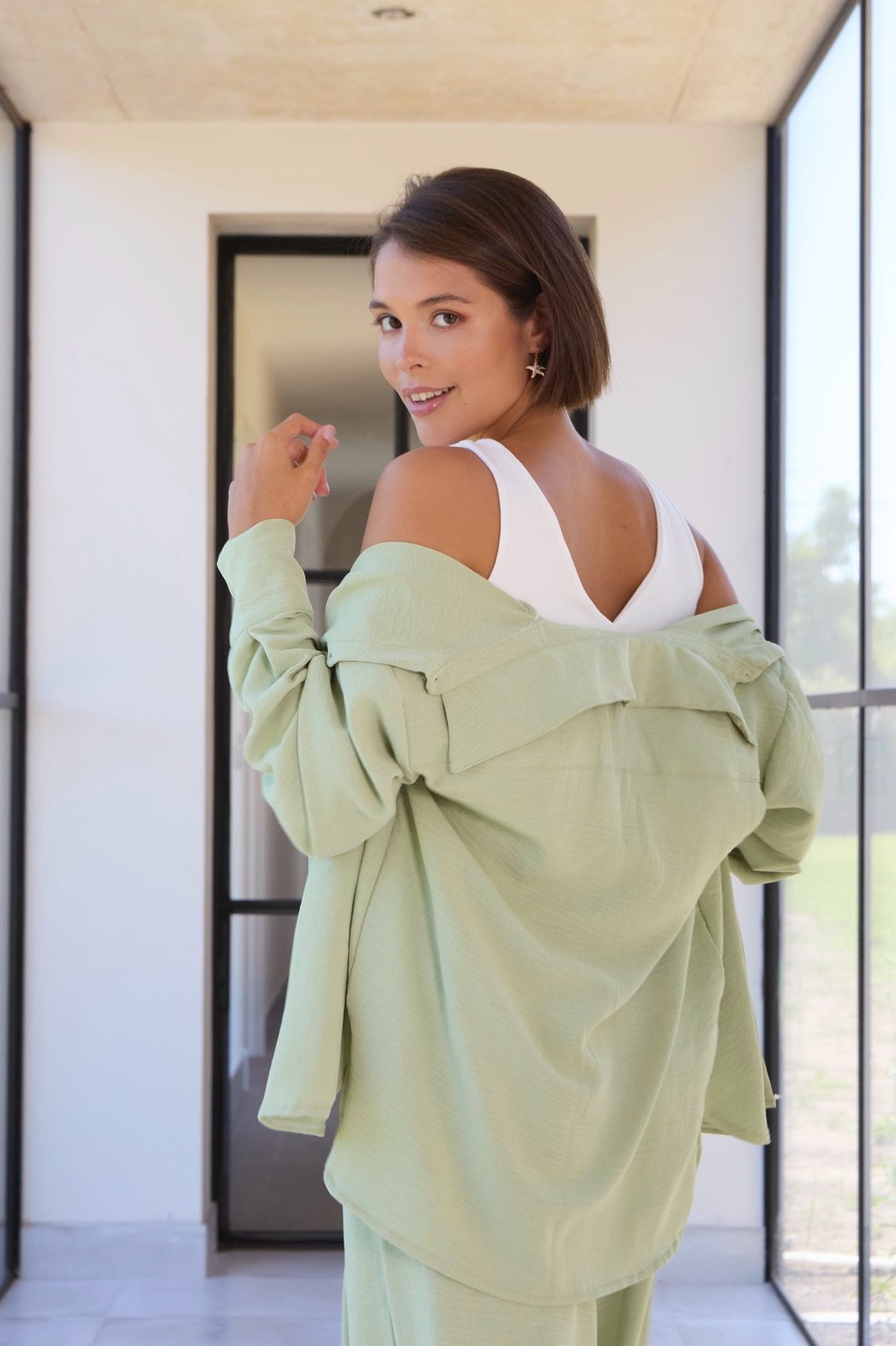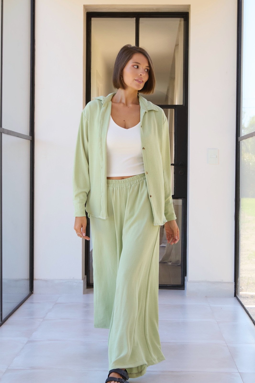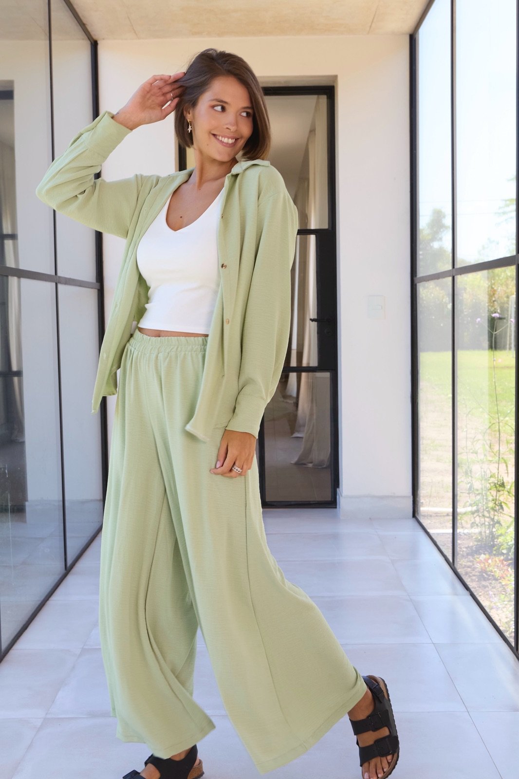 Conjunto de lino cey compuesto por camisa oversize y pantalón de pierna ancha.