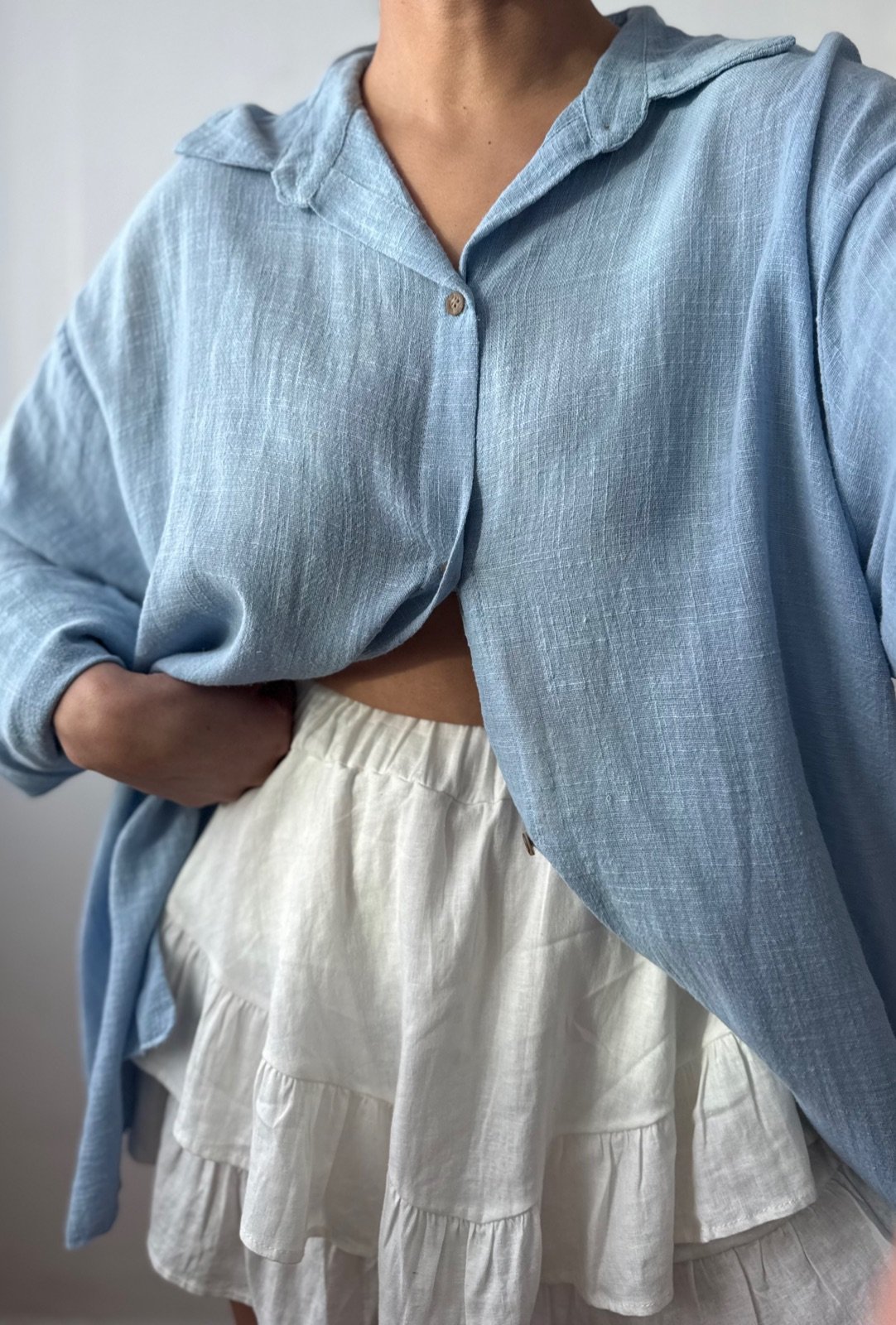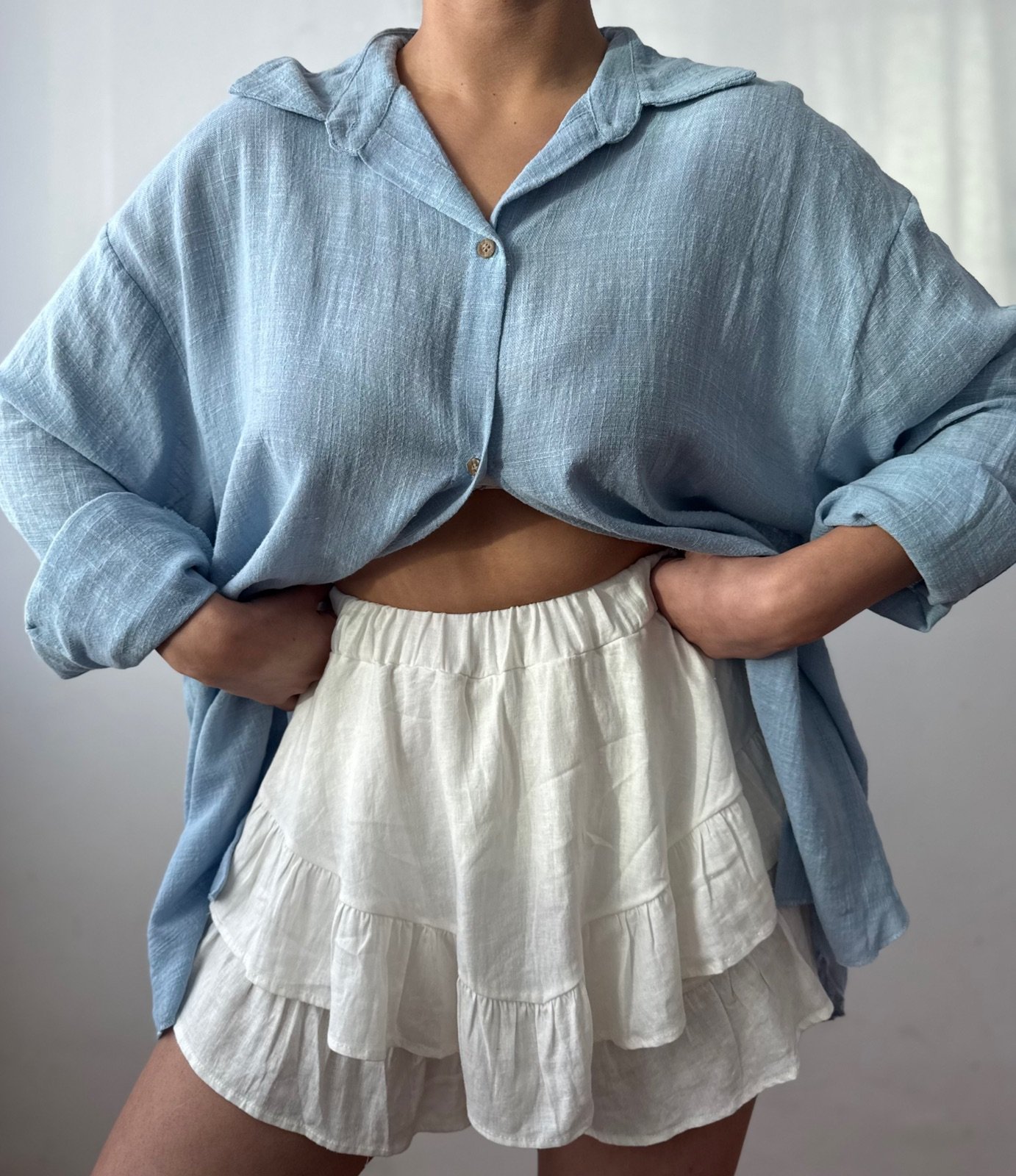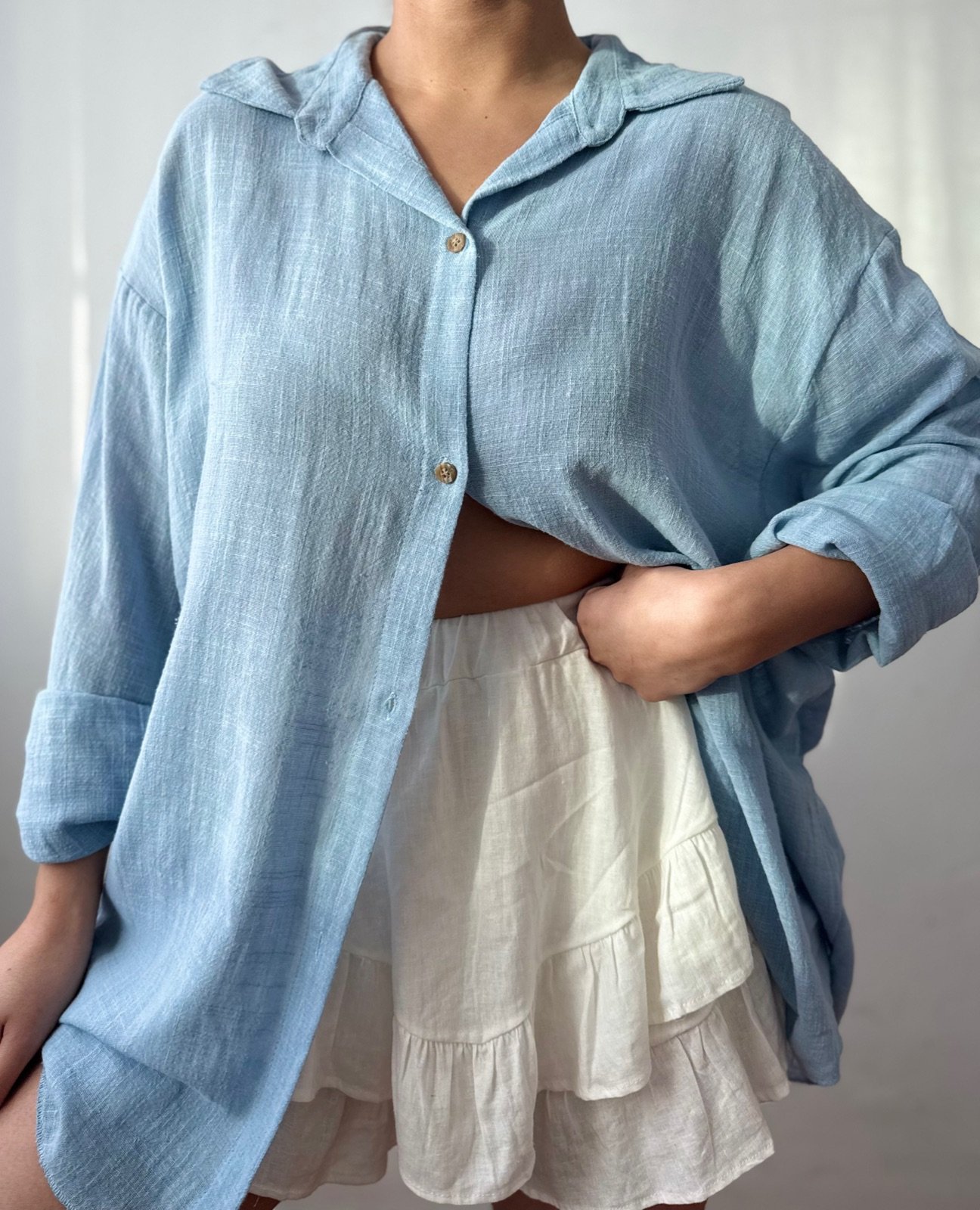 Camisa oversize de manga larga, confeccionada en una combinación de lino y bambula liviana de textura suave. Su diseño amplio con cuello clásico y botones en contraste la convierte en una prenda versátil, fresca y cómoda.